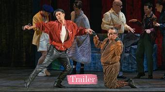 The stage resembles a pop-up picture book, the set pieces look like paintings and the individual rooms unfold on the revolving stage like the pages of a book. Whenever a wall is turned, it looks like a page is turned and a new room is created. The scenes take place in a New York apartment; in a ballet hall with a piano and ballet barres for training; in Rudolf Nureyev's apartment, in which a model train runs on the floor and in which a painting on the wall comes to life as dancers and singers act in this painting. Some scenes also take place in a park, with two-dimensional, painted trees emerging from the laced floor onto the stage. The costumes also look like paintings, with rough brushstrokes painted on the fabrics, so that the figures also look like drawings in the pop-up picture book. The dog is also represented by brown clothing, but he is not wearing a classic dog costume. The lighting is atmospheric, brighter in the ballet hall for the dance scenes, darker in Nureyev's apartment and in the park, as if on a moonlit night. The whole scene looks as if a painted picture has come to life.